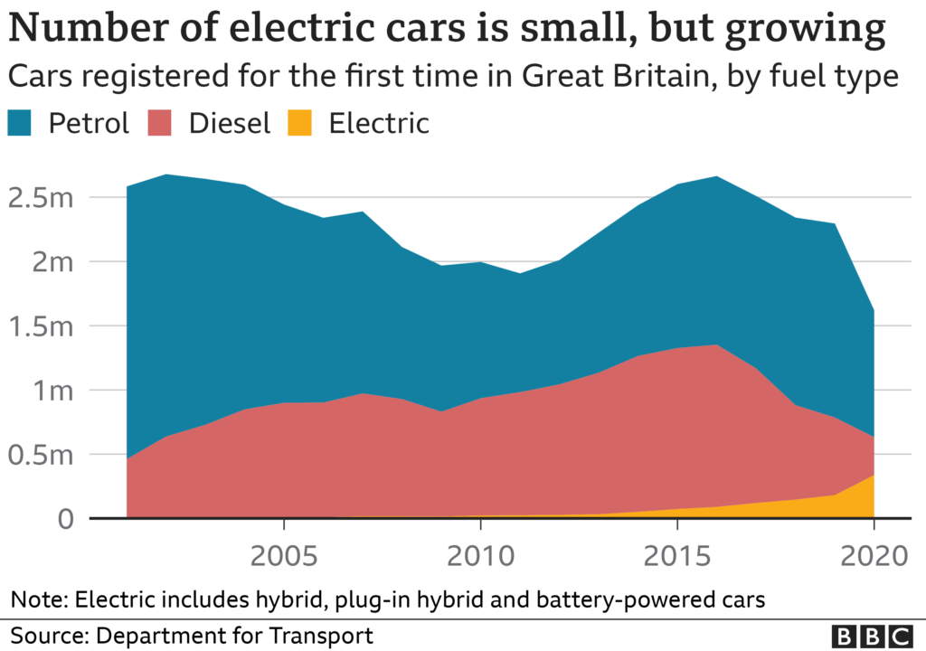 Cars and taxis accounted for 16% of UK emissions in 2019 and, in a bid to cut this, the government says no new petrol and diesel cars will be sold from 2030.